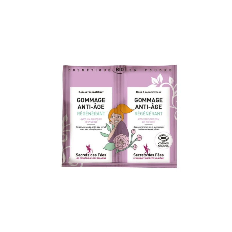 Le gommage anti-âge régénérant de la marque Secrets des Fées est une préparation en poudre à reconstituer soi-même avec de l’eau potable. Il est formulé avec de la pivoine, réputée pour ses propriétés lui permettant de lutter contre le vieillissement des tissus, mais aussi du mimosa tenuiflora, doté de pouvoirs régénérants, ou encore du thé vert, très riche en anti-oxydants. L’action combinée de ces divers ingrédients permet de restructurer efficacement l’épiderme.