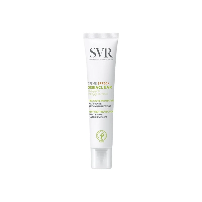Sebiaclear Crème SPF50+ nouvelle formule, 2 en 1, protection solaire et soin : réduit imperfections et points noirs, matifie et prévient les marques brunes ou rouges et l’effet rebond liés aux UV.